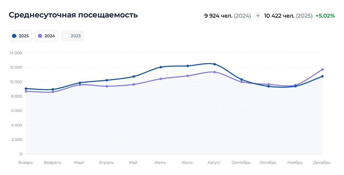 Тюмень, фонд «Активо девятнадцать») По итогам 2025 г. среднесуточная посещаемость ТЦ «Зеленый берег» выросла на 5% (по сравнению с 2024 г.). Основной рост посещаемости пришелся на весенние и летние месяцы и связан с несколькими факторами, в том числе с вводом в эксплуатацию новых домов в пешей доступности (якорные арендаторы ТЦ — продуктовая сеть «Лента» и гипермаркет товаров для дома Hoff). По данным Focus Technologies, посещаемость торговых центров в России сократилась на 3%. Среднесуточная посещаемость, а также другие отчеты в формате дашборда представлены в микросервисе «Дельта». #А19