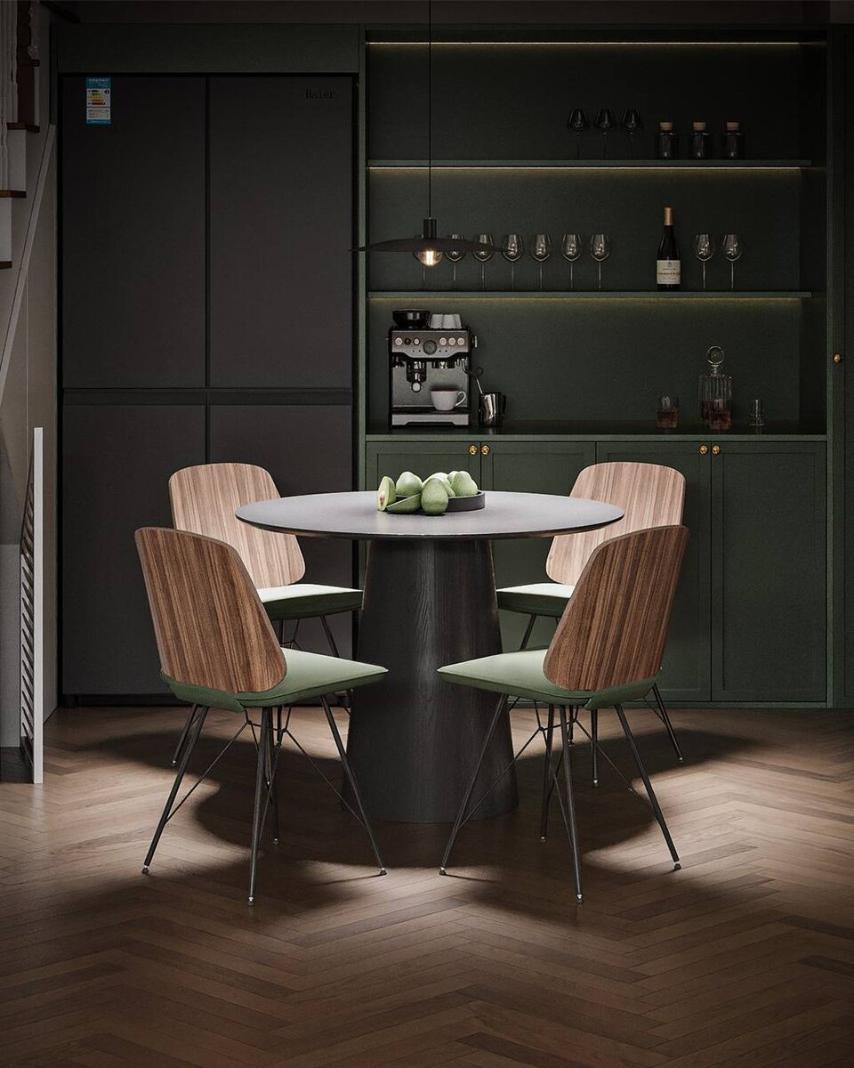 Конусное основание - актуальный дизайн столов с круглой столешницей. Мы изготавливаем столы диаметра 90, 100, 110 и 120 см в базовых оттенках нашей палитры: от натурального шпона дуба до черного, а также можем покрасить в любой RAL или NCS по запросу клиента. Стол Стулья