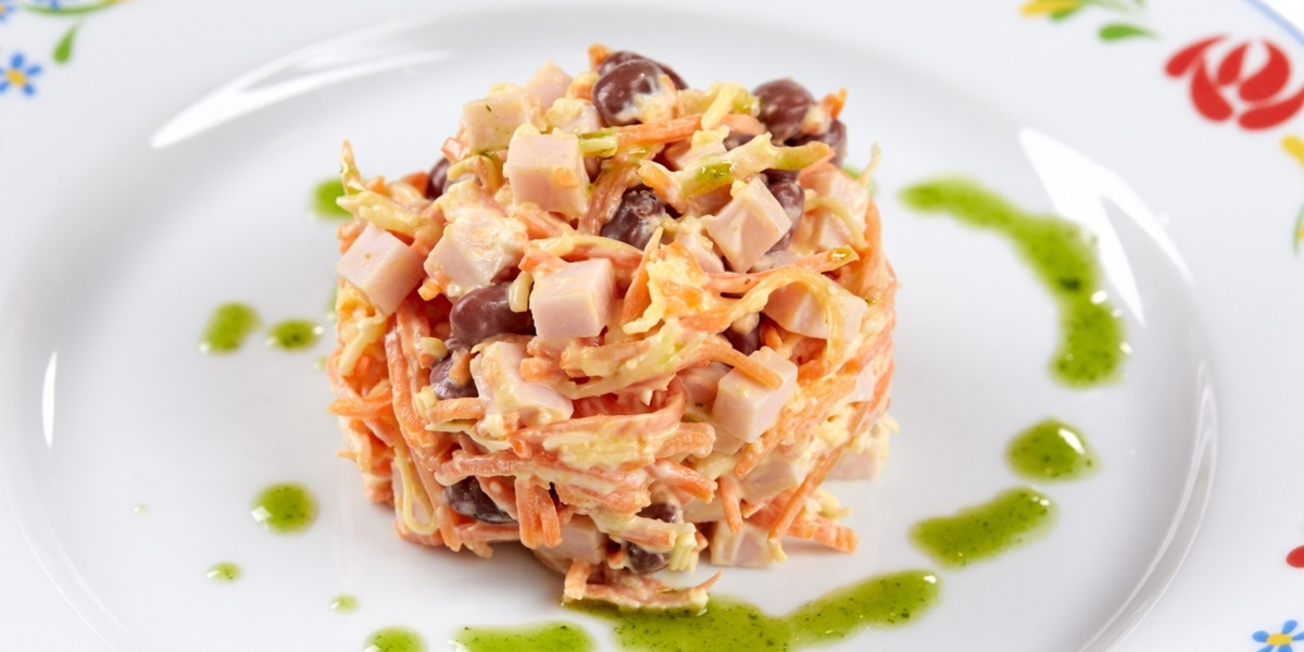 Вот тут и появляется он — салат «Выручайка». Название говорит само за себя. Фасоль, корейская морковь, сыр и ветчина — простые продукты, а вместе дают яркий, насыщенный вкус. Готовится буквально за 5 минут, без варки и лишней суеты. Настоящая палочка-выручалочка 👌 👉 Если любите быстрые и удачные рецепты — обязательно подписывайтесь на канал, здесь их много. 💡 Совет: ветчину можно заменить любой любимой колбасой — вкус каждый раз будет немного новым. Нарезаю ветчину (или колбасу) небольшими аккуратными кубиками. Сыр натираю на крупной тёрке, чеснок пропускаю через пресс — он даст тот самый аромат. В миске соединяю ветчину, сыр, чеснок, корейскую морковь и фасоль (жидкость с неё заранее сливаю). Заправляю майонезом и хорошо перемешиваю. ✔ готов за 5 минут