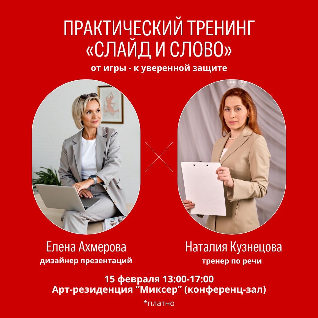 Знакомо: всё подготовлено, учтено и отрепетировано, и вот твоя очередь выступать, а в голове будто ветер гуляет? Слайды готовы, а уверенности нет? Голос подводит, мысли путаются, и в ответ - вежливое молчание зала... Такое бывает у многих: на защите проекта, на конференции, при презентации идеи клиенту. Дело не в тебе! Просто нас редко учат выступать системно - и делать классные слайды, и говорить убедительно. Исправляем это 15 февраля с 13:00 до 17:00 в арт-резиденции «Миксер». Забудем про скучные лекции - ты создашь свою презентацию через настольную игру «Креативный слайд» и подготовишься к её уверенной защите. Всё по-настоящему! Что прокачаешь: - Логичную структуру выступления - Стильные и понятные слайды - Уверенную речь без зажимов - Умение доносить идеи так, чтобы тебя действительно слушали С тобой будут два эксперта: Елена Ахмерова - уже больше 5 лет создаёт эффектные и логичные презентации. Наталия Кузнецова - столько же лет учит говорить уверенно и захватывать аудиторию.
