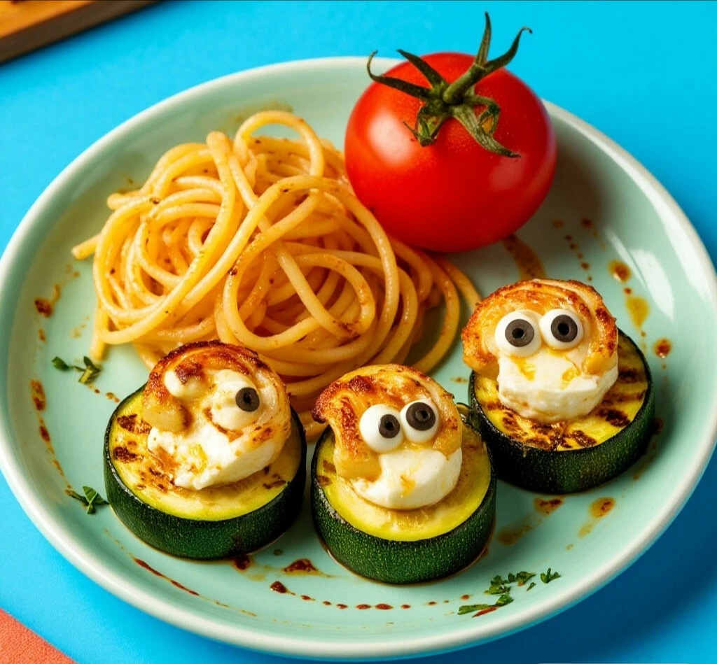4. Собираем улитку! Аккуратно воткните «голову» (помидорку на спагетти) в начало сырной дорожки на кабачке. Улитка готова ползти на тарелку! 🐌