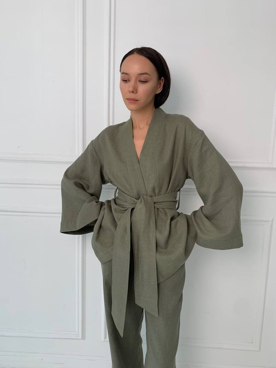 Кимоно-жакет в цвете «Шалфей». Свободный крой и широкие рукава с асимметричным краем. Брюки прямого кроя в тон для комплекта.