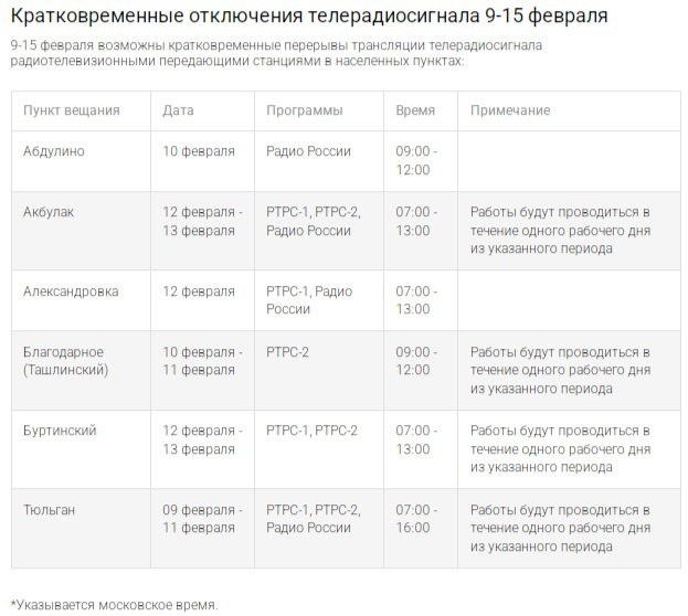 Филиал РТРС «Оренбургский ОРТПЦ» сообщает о планируемых технических работах. С 9 по 15 февраля в шести населённых пунктах Оренбургской области возможны временные отключения бесплатной трансляции телевизионных и радиоканалов. В этот период на станциях будут проводиться профилактические и иные плановые работы, для выполнения которых требуется отключение передающего оборудования. Подписаться в Max