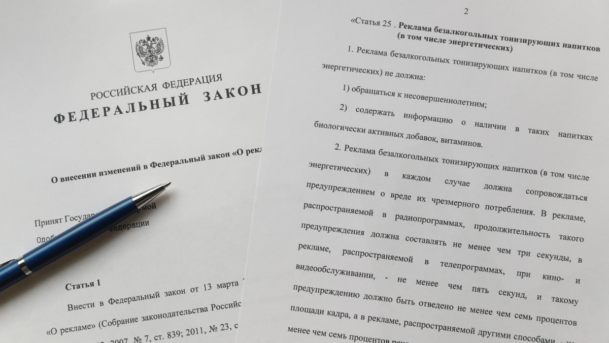 ч. энергетических напитков ➖ такая реклама должна обязательно содержать информацию о вреде чрезмерного потребления этих напитков; ➖ минимальная длительность данного предупреждения должна составлять в радиорекламе 3 секунды, в кино- и видеороликах – 5 секунд и занимать не менее 7 % площади кадра; ➖ в печатной и другой рекламе сведениям о вреде энергетиков должно быть отведено не менее 7 % рекламного пространства; ➖ такая реклама не должна обращаться к несовершеннолетним и рассказывать о наличии в данной продукции БАДов и витаминов. За нарушение указанных требований предусмотрена ответственность. Председатель профильного парламентского комитета Наталья Семёнова отметила: «Энергетические напитки содержат большое количество кофеина, сахара и других веществ, безмерное употребление которых ведёт к развитию сердечно-сосудистых заболеваний. При этом особому риску подвергается неокрепший организм детей. Обеспокоенные родители неоднократно обращались с данной проблемой к региональным парламе