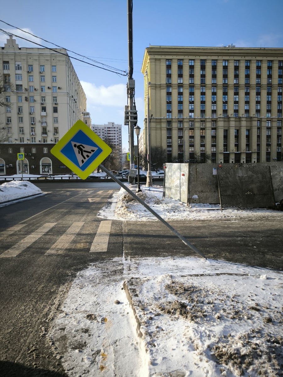 🆘На пешеходном переходе накренился дорожный знак — есть риск его падения.
