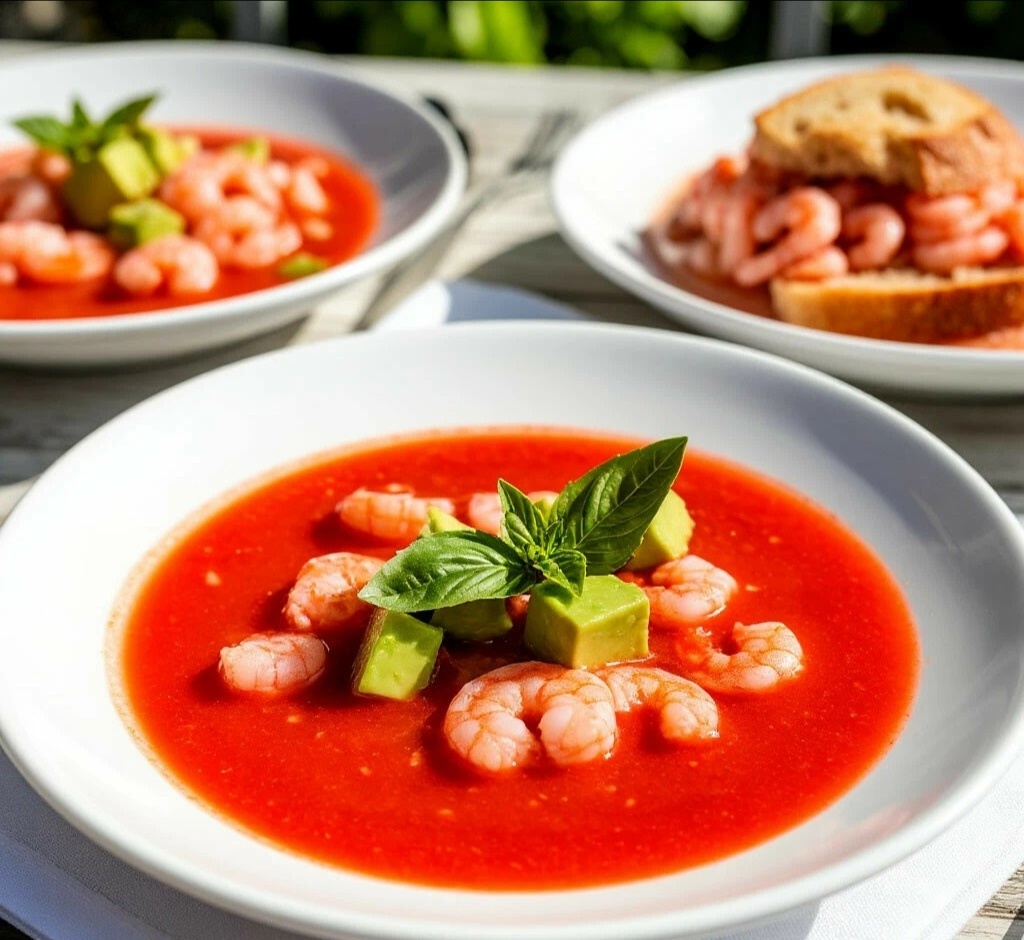 ИНГРЕДИЕНТЫ (на 3-4 порции): 🧾 ·Спелые мясистые томаты — 500 г 🍅 ·Огурец — 1 шт. (очистить от кожицы) 🥒 ·Красный сладкий перец — 1 шт. 🌶 ·Красная луковица — ½ шт. 🧅 ·Чеснок — 1 зубчик 🧄 ·Белый хлеб (мякиш) — 2 ломтика (размочить в воде) ·Оливковое масло extra virgin — 30-40 мл ·Винный уксус (красный или белый) — 1 ст.л. ·Соль, свежемолотый чёрный перец — по вкусу Для подачи: ·Авокадо — 1 шт. 🥑 ·Отварные креветки или крабовые палочки — по желанию 🍤 ·Свежий базилик или петрушка 🌿 ·Хрустящие гренки или хлебцы