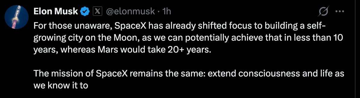 Для тех, кто не знал, SpaceX уже сместила акцент на строительство саморазвивающегося города на Луне, чего мы можем достичь менее чем за десять лет. SpaceX также будет стремиться построить город на Марсе и приступить к этому примерно через пять-семь лет, – написал Маск в соцсети X. На создание марсианского города, по оценке Маска, уйдет более 20 лет.