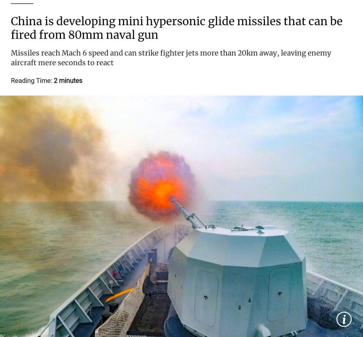 ⚡️🇨🇳Китай разрабатывает мини-гиперзвуковые ракеты, запускаемые из 80-мм морских орудий