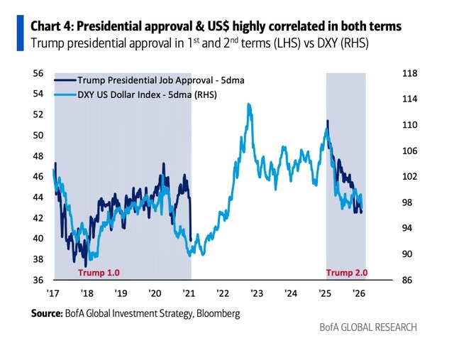 💳 Исследователи из BofA Securities заметили интересный феномен: рейтинг одобрения президента Дональда Трампа удивительно точно коррелирует с курсом доллара США (индекс DXY). Несмотря на кажущееся несоответствие — ведь слабая валюта теоретически должна помогать промышленности в «колеблющихся штатах ржавого пояса», таких как Пенсильвания, Мичиган и Висконсин, — оба показателя синхронно снижаются. 📈 Парадоксальная связь: 🔤С момента вступления Трампа в должность доллар подешевел примерно на 10%. 🔤Одновременно рейтинг одобрения Трампа тоже пошел вниз. 💬 Почему это странно? 🔤Обычно слабая валюта полезна для экспортно-ориентированных отраслей, стимулирует местное производство и рабочие места. 🔤Следовательно, следовало бы ожидать роста рейтинга одобрения президента, но на практике этого не происходит. 🔍 Анализ: По мнению аналитика Майкла Хартнетта, подобная динамика может указывать на неудовлетворенность населения действиями администрации Трампа. Возможны психологические и эм