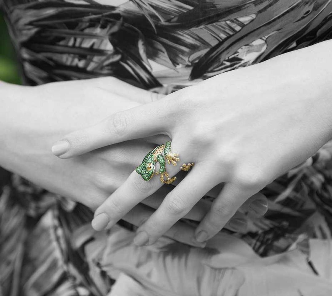 Кольцо Chopard «Лягушка и корона» изображает лягушку из белого золота и изумрудов, держащую корону с бриллиантом огранки «бриллиант», окруженным более мелкими желтыми бриллиантами. Изысканное колье с лягушкой из реалистичной коллекции Chopard «Animal World» не менее впечатляет: паутина из бриллиантов, цаворитов и сапфировых капель, на вершине которой покоится розовая бриллиантовая лягушка, окруженная изумрудными кувшинками с кабошонами из аквамарина, изображающими облако яиц.