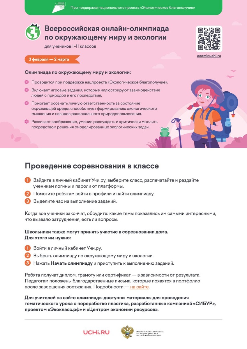 Всероссийская онлайн-олимпиада по окружающему миру и экологии для школьников 1–11-х классов пройдет с 3 февраля по 2 марта 2026 года в целях информационного продвижения мер национального проекта «Экологическое благополучие». Цель олимпиады — формирование у молодежи ответственного отношения к использованию природных ресурсов. Организаторы Олимпиады — АНО «Национальные приоритеты» совместно с образовательной платформой УЧИ.РУ при поддержке Министерства природных ресурсов и экологии Российской Федерации. Участие в олимпиаде проходит на безвозмездной основе на образовательной платформе УЧИ.РУ ecomir.uchi.ru Также в этом году пройдут следующие олимпиады: Всероссийская онлайн-олимпиада по финансовой грамотности и предпринимательству, Всероссийская онлайн-олимпиада «Безопасные дороги», Всероссийская онлайн-олимпиада «Русский язык и культура России», Всероссийская онлайн-олимпиада «Безопасный интернет», Всероссийская онлайн-олимпиада «Наука вокруг нас».