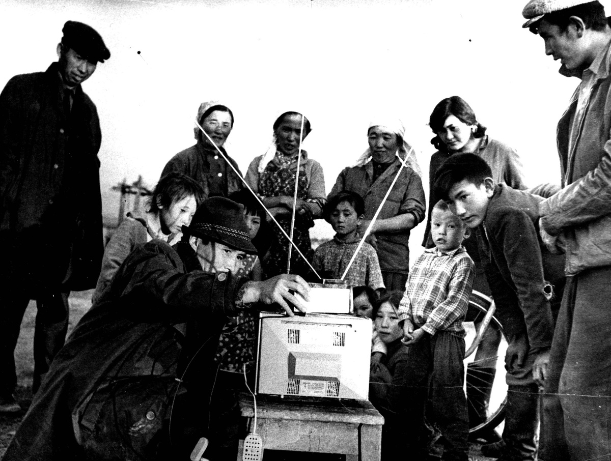Жители села Кош-Агач впервые смотрят телепередачи. Первый слева Бельбеков Г.А. - первый секретарь Кош-Агачского районного комитета КПСС. Ведет настройку программы Бегалинов В.Б. - первый секретарь Кош-Агачского районного комитета ВЛКСМ. [1970-1973].