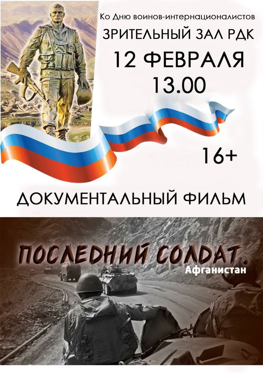Дата: 12 февраля в 13:00 Зал РДК Документальная лента «Последний солдат. Афганистан» Этот фильм станет памятником трагической странице истории России, рассказывая о событиях Афганского конфликта 1979—1989 годов через личные воспоминания участников тех далеких дней. Уникальные встречи с ветеранами-"афганцами" и даже бывшими противниками раскрывают ранее неизвестные факты и тайны, доступные только узкому кругу лиц — военным, разведчикам и политическим деятелям. Среди ярких моментов картины выделяется интервью с легендарным лидером афганского сопротивления Ахмадом Шахом Масудом. Его откровенные рассказы дополнены редкими архивными съемками, сделанными самими моджахедами, обеспечивая уникальную точку зрения на события тех времен. Фильм охватывает весь спектр героизма и трагедии советской армии, от первого штурма дворца Тадж-Бек до гибели последнего солдата, павшего уже после официального завершения конфликта — 7 февраля 1989 года. Этот проект является данью памяти всем участникам Афга