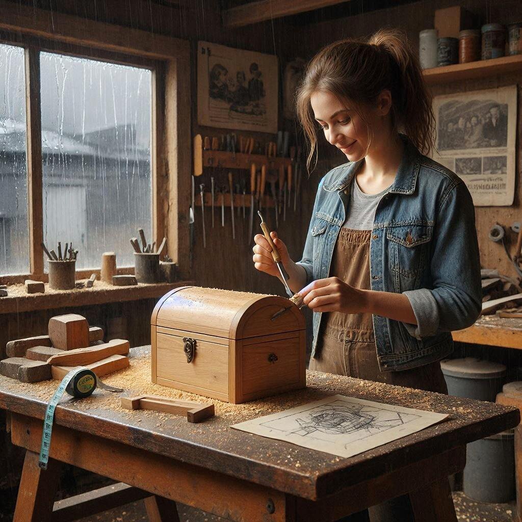 За книгами, в дальнем углу полки, ее пальцы наткнулись на что-то твердое, завернутое в старую ткань. Марина достала сверток и развернула его. Это была деревянная шкатулка, точнее, ее каркас. Ни крышки, ни дна, только стенки, тщательно вырезанные из темного дуба с изящными резными уголками. Рядом лежали тонкие пластинки шпона, кусочки стекла, маленькие латунные петли и несколько листов с эскизами.