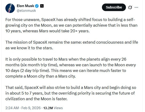 "SpaceX уже переключила свое внимание на строительство саморазвивающегося города на Луне, поскольку это потенциально возможно менее чем за 10 лет, в то время как на Марс потребуется более 20 лет", — написал американский предприниматель в соцсети X. К строительству города на Марсе SpaceX намерена приступить через пять–семь лет, а с Луной получится быстрее, сообщил Маск. 🔴 Читайте Sputnik Беларусь в MAX