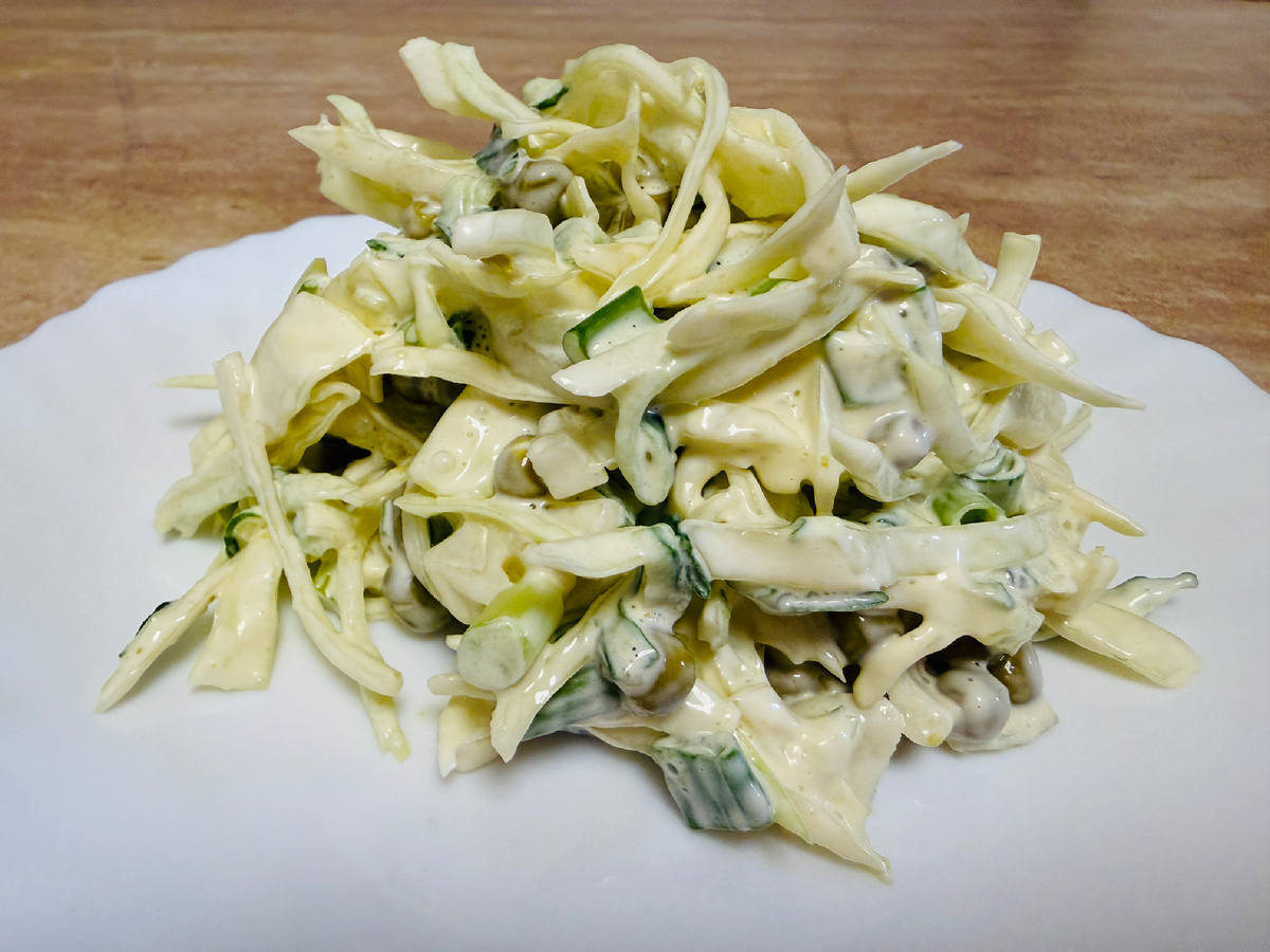 Добро пожаловать на мою кулинарную страничку! Вкусный, простой и бюджетный салат из капусты приготовить очень легко. Буквально 10 минут — и на вашем столе уже будет это замечательное витаминное блюдо. Такой салат, наверное, один из самых популярных, ведь ингредиенты для его приготовления совсем недорогие и вполне доступные. Этот салат идеально подходит в качестве лёгкой закуски или салата на обед, либо на ужин. Он освежает своим хрустящим вкусом и прекрасно сочетается с различными блюдами. Обязательно приготовьте его, порадуйте своих близких и наслаждайтесь свежими овощами в каждом кусочке. Приготовление блюда: 1. Капусту тонко нашинковать и помять руками, чтобы она стала влажной и начала давать сок. 2. Огурцы натереть на крупной терке и отжать сок. 3. Зеленый лук мелко нашинковать ножом. 4. С консервированного горошка слить жидкость и добавить его к салату. 5. Добавить соль по вкусу, заправить салат майонезом и все хорошо перемешать. Ингредиенты: Приятного аппетита!