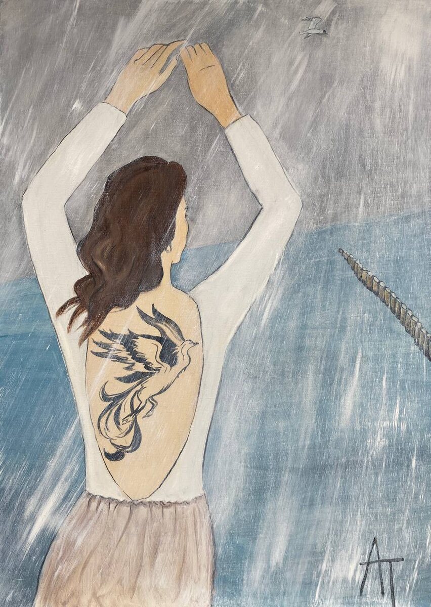Этот малыш ещё слишком слаб, чтобы лететь самому, но уже достаточно силен, чтобы довериться неласковому ветру Балтики. Пепел, из которого он родился, хранил в себе память о Парижах и запахе зимней Сены, о Лондонах с автобусными остановками посередине мостов через Темзу, о готических кварталах, Ватиканах, фьёрдах, небоскребах Москва-Сити, о других морях, других птицах и других ветрах. Все это будет жить в памяти ДНК нового Феникса, начинающего свой путь в маленькой точке на карте: Зеленоградске Калининградской области. В краю, хранящем великие тайны памяти и других возрождений среди маленьких отелей и неестественно уютных улиц, благоухающих розами. На берегу моря, обрушивающегося на город вперемежку с дождем. Души людей и души городов порой так похожи. —— Феникс. Зеленоградск. Холст, масло; 70х50 см. Находится в частной коллекции.