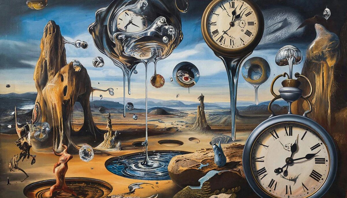 Время словно растворяется в тумане вечности, оставшись лишь мерцающим отражением среди серых теней реальности. Тик-так стрелок медленно затихает, уступая место молчаливым мирам, рождённым воображением художника. По застывшим улицам лениво ползут часы, превращаясь в расплавленные куски сыра, стекающие с облаков над городом мечты.