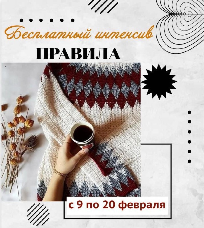 Прежде чем мы отправимся в увлекательное путешествие по миру жаккардового вязания, давайте ознакомимся с правилами интенсива. Пожалуйста, прочтите внимательно и подтвердите свое согласие! Правила нашего вязального приключения: 1. Интенсив включает первые 6 уроков из полного курса "Все о жаккарде крючком. Круглая кокетка"". Они будут публиковаться здесь, в канале. Полный курс состоит из 52 уроков и проходит на удобной обучающей платформе. 2. Новые задания будут появляться в 20:00 по московскому времени. Это время выбрано с учетом разных часовых поясов. На выполнение каждого задания у вас будет 48 часов (кроме первого - на него даю 24 часа, так как оно легкое). 3. Ваши готовые работы нужно выкладывать в комментариях к соответствующему заданию до выхода следующего. 4. За каждое выполненное в срок задание вы будете получать нашу внутреннюю валюту - "ажурики". Их можно будет использовать для приобретения полного курса. За каждое задание вы получаете 350 ажуриков (эквивалент 350 рублей)