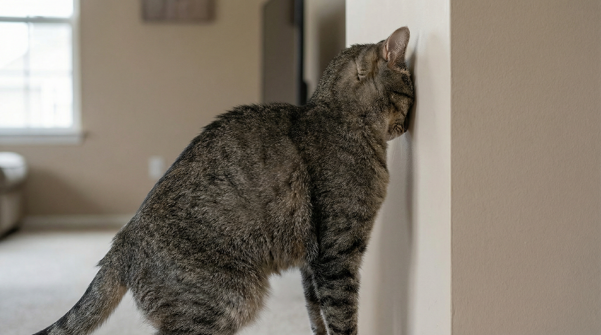 Кошки иногда трутся головой о стены, углы, мебель. Это маркировка территории через железы на морде. Кошка трётся, двигается, переходит к другому объекту. Это нормально. Ненормально, когда кошка упирается лбом в стену и стоит неподвижно. Минуту, две, пять. Взгляд пустой, тело напряжённое. Это не расслабление, не игра, не любопытство.