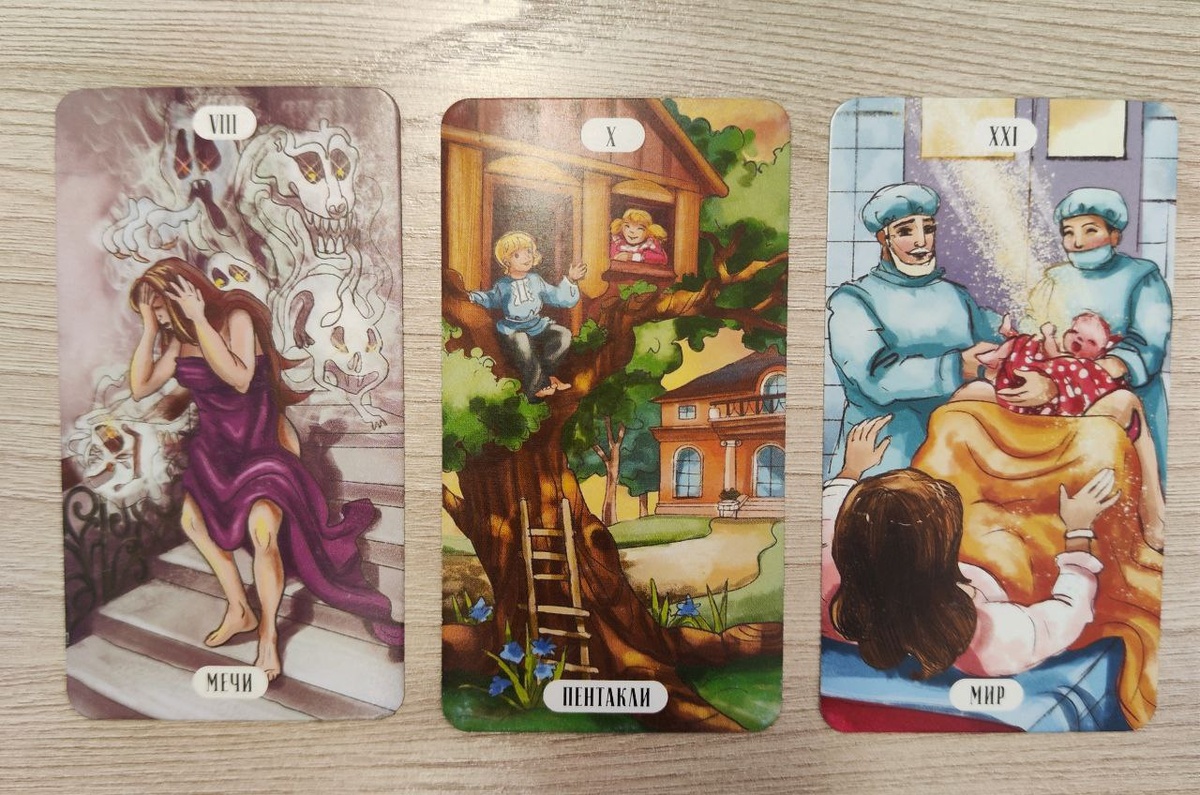 ✨ Дорогие друзья! Сегодня у нас в центре внимания три удивительные карты Таро: Восьмёрка Мечей, Десятка Пентаклей и Мир