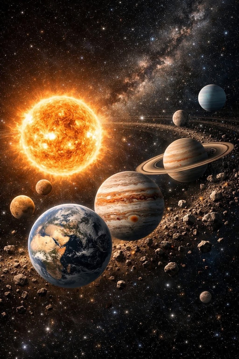Под действием гравитации облако стало сжиматься, в центре образовалось горячее протосолнце, которое постепенно прогревалось и вызвало термоядерные реакции, став нашим Солнцем. Вокруг него находился диск газа и пыли, где частицы столкнулись и склеились, образуя более крупные тела — протопланеты. Внутренняя зона, где было очень жарко, породила каменные планеты: Меркурий, Венера, Земля и Марс. 🌍🌍🌍🌍🌍🌍🌍🌍🌍🌍 Позже Земля столкнулась с другой протопланетой, и обломки образовали Луну. В более холодных внешних областях накапливались легкие газы, рождались газовые гиганты Юпитер и Сатурн, а лед Уран и Нептун составляли воду, аммиака и метана. Остальной материал, не вошедший на планеты, образовал пояс астероидов, пояс Койпера и облако Оорта. Молодая Земля была сожжена, лавовыми океанами и плотной атмосферой без кислорода. Со временем планета остыла, вода скопилась в океана Показать полностью... Терра инкогнита | Неизвестная земля