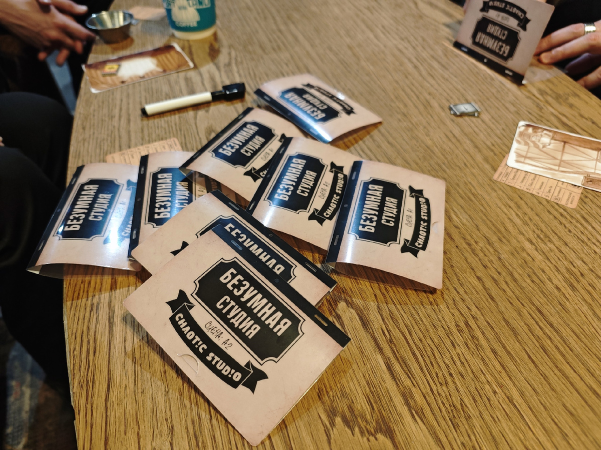 Вчера случилась спонтанная партия в игру Безумная студия))) Для начала предыстория: кто не знает, я работаю преподавателем английского языка, а также по воскресеньям провожу английский клуб в Саратове. Мы встречаемся в кофейне, первую половину разговариваем на определенную тему (все вопросы и активности я готовлю заранее), а во второй играем в различные разговорные игры. Так вот, за 15-20 мин до выхода из дома я подумал "Дай-ка попробую предложить ребятам после клуба поиграть в какую-нибудь настолочку". Записалось на встречу 7 человек, а у меня лежит не игранная Безумная студия (она до 6, но я был готов отдать свое место). И на случай, если многие уйдут, я еще взял Омерту (она от 3 до 5). И что вы думаете? Открытых для новых активностей людей оказалось куда больше! Лишь двоим надо было уйти после клуба, остальные остались играть😎В общем играли мы в Безумную студию вшестером. Безумная студия - это патигейм-рисовалка для 3-6 игроков. Игрокам необходимо изображать на своих планшетах (с