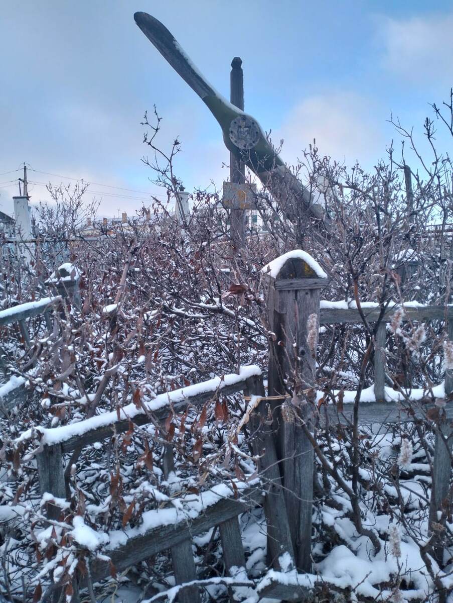 На исторически первом кладбище Чокурдаха есть уникальное для этих мест захоронение. Мне как краеведу любителю очень хотелось бы установить подробности, но по всем упрямым фактам сделать это крайне затруднительно. Какая информация имеется на сегодня? Довольно негусто: старое недействующие кладбище, на ней могила с воздушным винтом, густо поросшая тальником, то есть зацепки нулевые. Кто похоронен здесь, как звали погибшего, из местных жителей никто не помнит, а многие даже и не знают об этом месте. Наверное, это лётчик из Полярной авиации, а может быть ВВС. В былые годы существовала традиция на месте захоронения лётчика водружать винт от самолёта. Могила обнесена аккуратной оградкой, столяр изготовивший её явно мастер своего ремесла. За столько лет ограждение естественно покосилось, но её детали почти нетронуты. Вместо надгробной пирамидки, которая в те времена в основном использовалась в похоронном деле, деревянный пропеллер на балке от самолёта, возможно от ПО-2, обшитый как будто перк