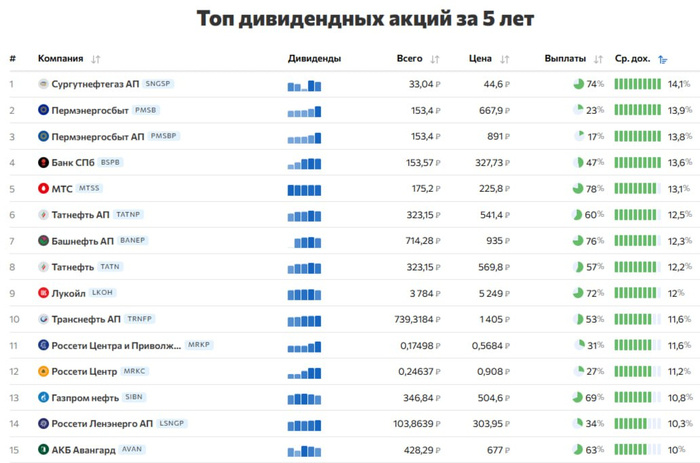 Довольно интересный рейтинг дивидендных акций, составленный из компаний, которые платили дивиденды последние 5 лет. Если компания пропустила выплату хотя бы один год, то в рейтинг она не попала (к примеру - Сбербанк). Как рассчитывается рейтинг В топ включены компании, которые платили дивиденды все 5 лет подряд (2021-2025). Основной показатель — средневзвешенная дивидендная доходность: недавние годы имеют больший вес (2025 — вес 5, 2024 — вес 4, и так далее до 2021 — вес 1). Это позволяет учесть актуальную дивидендную политику компании, а не только историю. Думаю для многих стали большой неожиданностью компании, которые возглавили рейтинг. Это далеко не те хайповые акции, которые постоянно у всех на виду, и которые всегда и везде обсуждают, но тем не менее, они продолжительное время радуют своих инвесторов. Топ дивидендных акций России Лидерами рейтинга стали Сургутнефтегаз АП (14, 1%), Пермэнергосбыт (13, 9%), Банк СПб (13, 6%), МТС (13, 1%) и Татнефть АП (12, 5%). В топ-10 также вход