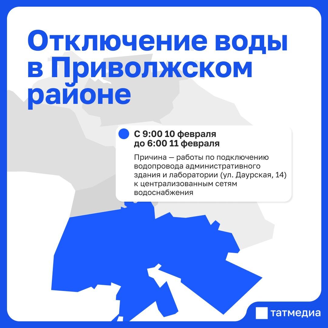 Причина – работы по подключению водопровода административного здания и лаборатории (ул. Даурская, 14) к централизованным сетям водоснабжения. Воды не будет с 9:00 10 февраля до 6:00 11 февраля. С подробным списком всех адресов, где пройдут отключения можно познакомиться по ссылке. @tatmediaofficial | Все каналы Татмедиа ™️ 1-й новостной MAX-канал Татарстана - подпишитесь.