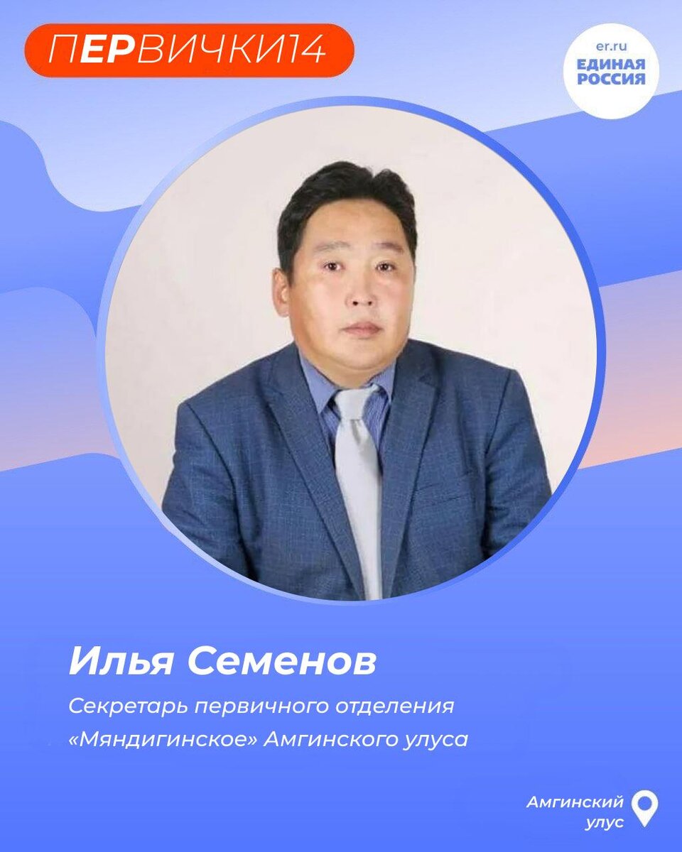🐻❄️ С 2015 года секретарем первичного отделения «Мяндигинское» Амгинского улуса является глава сельского поселения «Мяндигинское» Илья