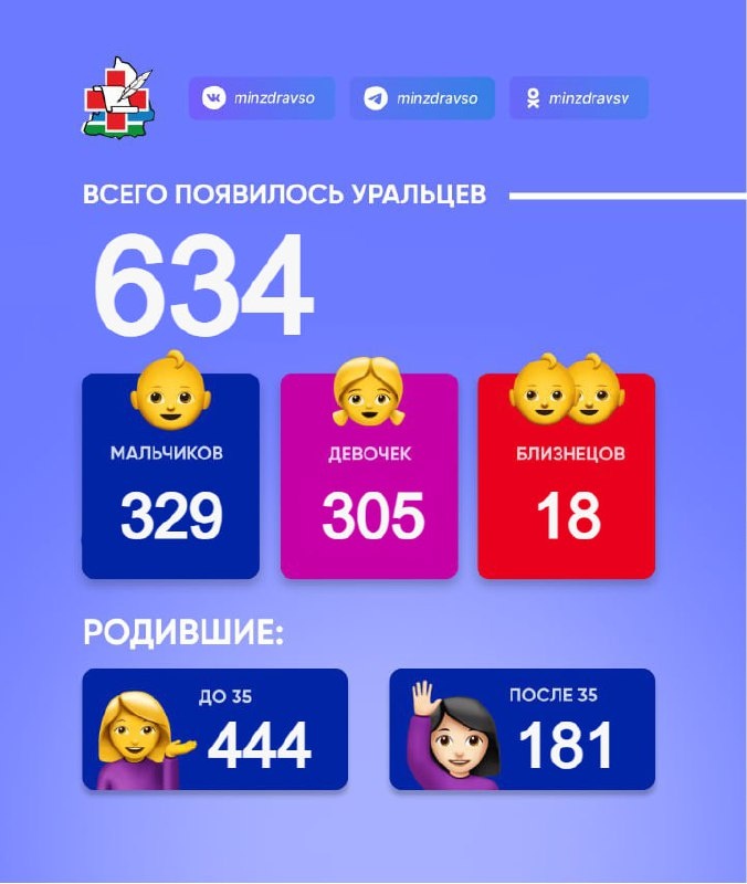 ! 🤱За прошедшую неделю в Свердловской области на свет появились 634 малыша: 💙 329 мальчиков и 305 девочек 💖, из них 9 пар близнецов! 444 мамы родили до 35 лет. 181 мамочка родила после 35 лет. Для одной из мамочек это стали восьмые по счету роды. 188 малышей стали вторыми детьми у своих мам. Охрана материнства и детства является важной составляющей ежедневной работы специалистов регионального Минздрава. Поздравляем! 💬Мы в MAX / 📱 Мы в ВК / 📱 Подпишись