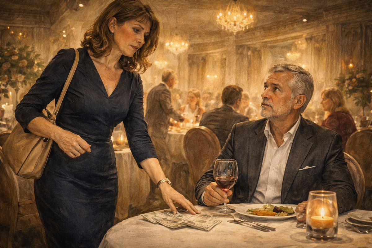Ресторан он выбрал сам — такой, где меню в кожаном переплёте, а люди разговаривают полушёпотом, чтобы не дай бог не прозвучать “не своего круга”.