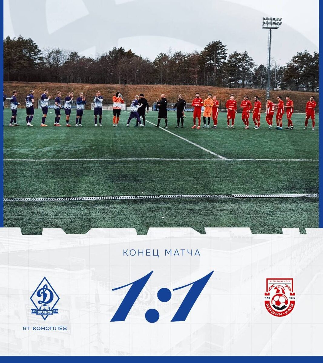 Брянское «Динамо» завершило учебно-тренировочный сбор в Кисловодске контрольным матчем против пятигорского клуба «Машук-КМВ». Встреча, состоявшаяся 8 февраля, завершилась ничьей по итогам основного времени, однако пресс-службы команд представили разные данные об итоговом счете. Первый тайм прошел в равной борьбе и завершился без забитых мячей. Во втором игровом отрезке счет открыли подопечные Андрея Канчельскиса: на 61-й минуте отличился Даниил Коноплёв. Пятигорский коллектив отыгрался на 78-й минуте благодаря точному удару Чингиза Магомадова. В концовке встречи Магомадов имел шанс оформить дубль, но не реализовал одиннадцатиметровый удар. По истечении 90 минут игры арбитр зафиксировал ничью - 1:1. При этом официальные ресурсы клубов по-разному интерпретировали итоги встречи. Пресс-служба брянского «Динамо» сообщила о «мирном» исходе матча. В свою очередь, представители «Машука-КМВ» заявили о победе своей команды со счетом 4:1, учитывая результат дополнительного третьего тайма, в котор