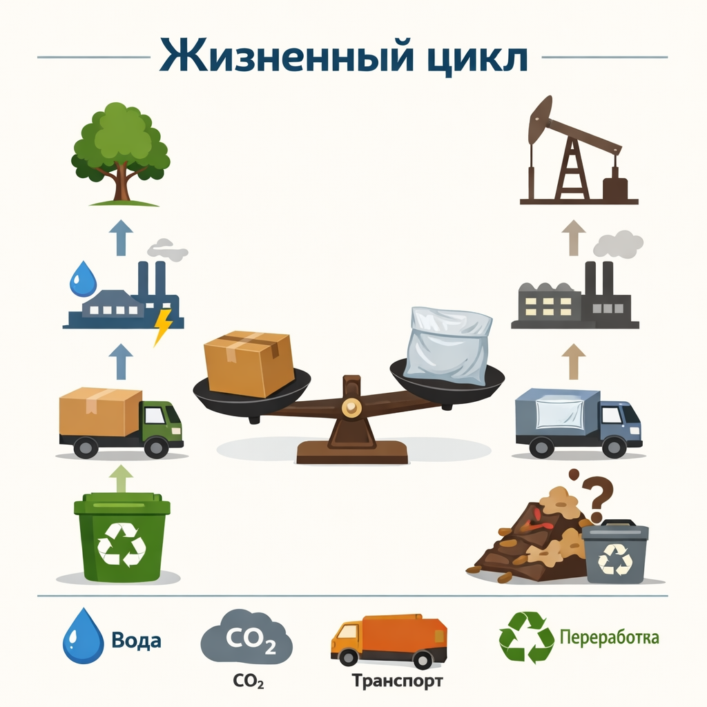 Тренд на «эко» — это уже не просто маркетинг, а требование рынка. Но когда дело доходит до выбора упаковки, всё превращается в мифы. Давайте разбираться на фактах. Самое опасное заблуждение. Биоразлагаемый пластик (кукурузный крахмал, PLA) распадается только в промышленных компостерах при высокой температуре. На свалке он будет лежать десятилетиями, как и обычный. Бумага/картон, попадая на свалку без кислорода, также разлагается с выделением метана — мощного парникового газа. Вывод: Упаковка становится экологичной не из-за материала, а из-за грамотной системы сбора и переработки. Не всегда. Нужно смотреть на полный жизненный цикл (LCA): Производство: На производство картона тратится больше воды и энергии, чем на многие виды пластика. Зато сырье (дерево) — возобновляемое. Логистика: Картон весит больше. Больше вес → больше выбросов при транспортировке. Здесь тонкий пластиковый пакет может оказаться «чище». Переработка: Макулатуру принимают почти везде, но она не может быть переработана