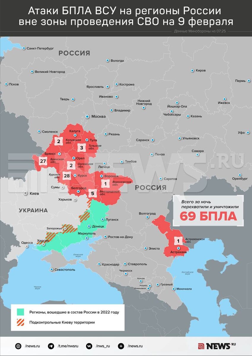 28 дронов уничтожили над Курской областью, 27 — над Брянской, пять — над Белгородской, три — над Тульской, по два — над Орловской и Калужской, по одному — над Астраханской и Воронежской. ⭕️ Подписаться | Мы в MAX | Буст
