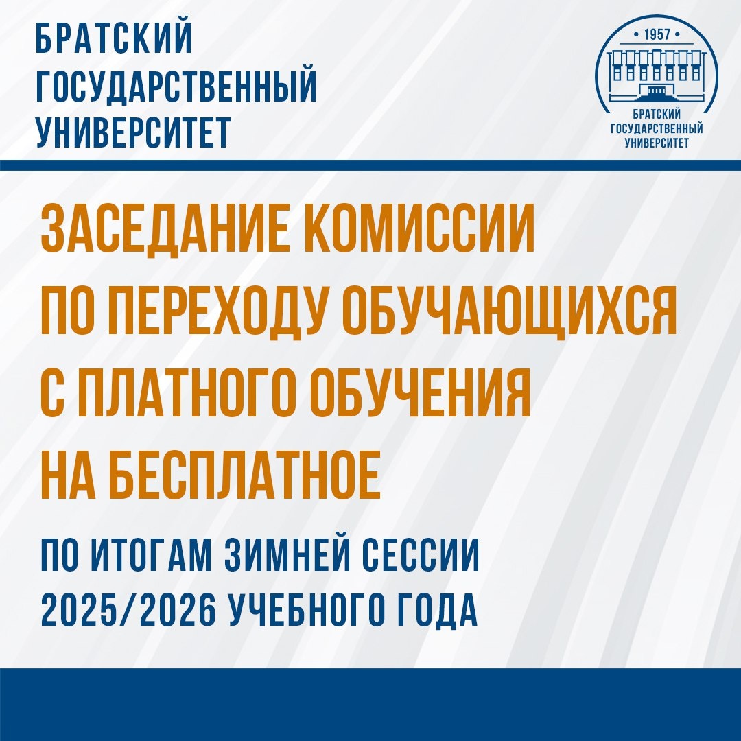 итогам зимней сессии 2025/2026 учебного года. В соответствии с Положением о порядке перехода обучающихся по образовательным программам среднего профессионального и высшего образования с платного обучения на бесплатное федерального государственного бюджетного образовательного учреждения высшего образования «Братский государственный университет», на основании протоколов заседаний факультетов и прилагаемых к ним документов, решением Комиссии университета переведены с платного обучения на бесплатное с 1 февраля 2026 г. 8 обучающихся: гуманитарно-педагогический факультет: 📝по программе специалитета 44.05.01 «Педагогика и психология девиантного поведения» - 3 чел.; 📝по программе бакалавриата 44.03.02 Психолого-педагогическое образование, профиль «Психология образования» - 1 чел. факультет магистерской подготовки: 📝по программе магистратуры 15.04.05 Конструкторско-технологическое обеспечение машиностроительных производств, 📝программа «Технология машиностроения» - 1 чел.; по программе м
