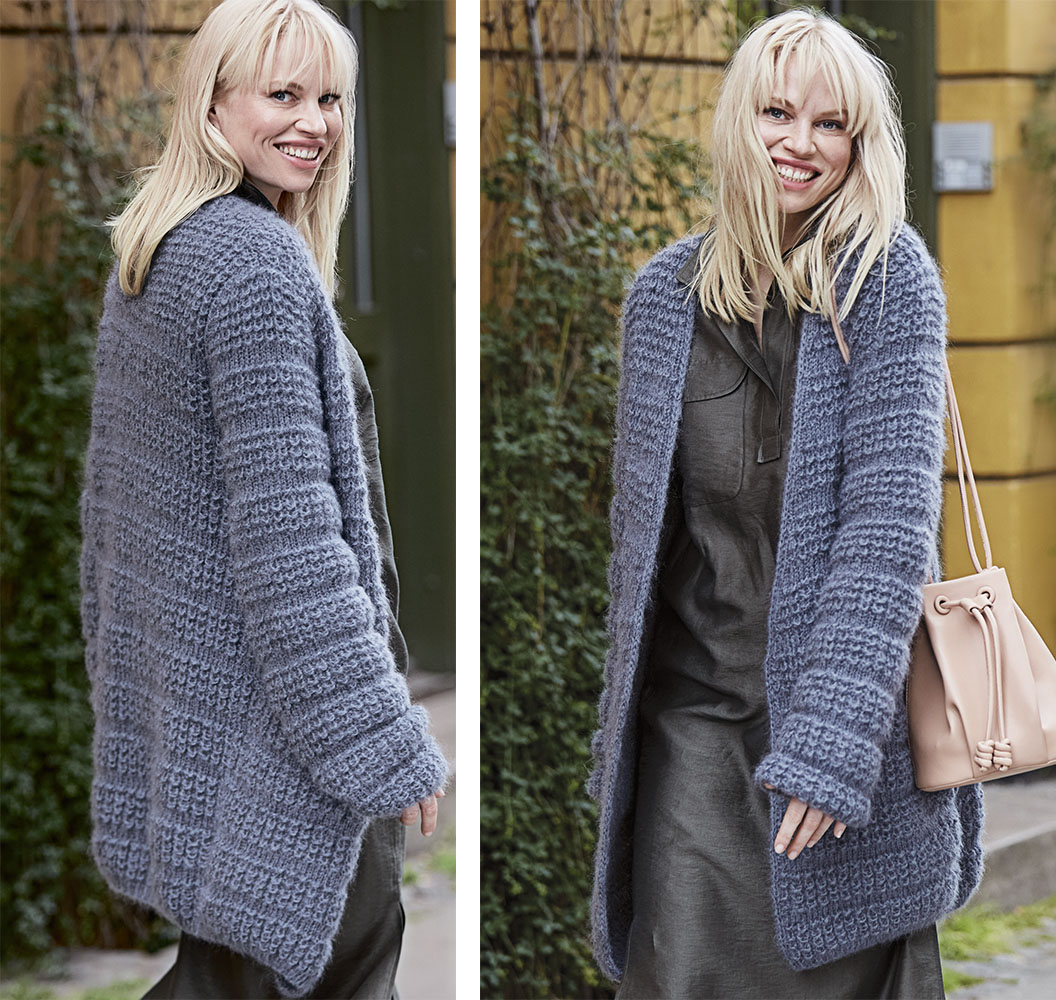 (70% мохер, 30% шёлк; 210 м / 25 г) — 16 (18) 19 мотков в благородном сине-сером оттенке.Работа выполняется в три нити одновременно от начала и до конца изделия — за счёт этого кардиган получается объёмным, тёплым и очень эффектным.
