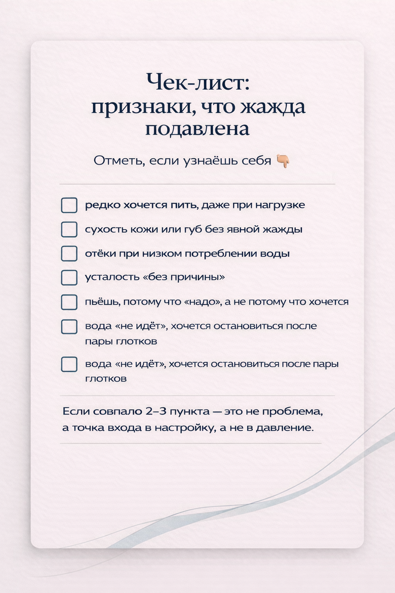 Почему вы почти не чувствуете жажду и почему это не всегда хороший знак Многие говорят: «Я просто не хочу пить. Мне нормально». И это звучит логично — если организму нужна вода, он же должен попросить? Не совсем. Как это часто выглядит в реальной жизни Утро — кофе. В течение дня — чай, кофе, ещё чай, иногда вода «за компанию». К вечеру — усталость, сухость губ, тяжесть в теле, отёки. А жажды как таковой нет. И кажется: раз не хочется пить, значит всё в порядке. Что происходит на самом деле Механизм жажды — это не привычка и не сила воли. Это сигнальная система, связанная с нервной системой, гормонами и балансом жидкости. При длительном стрессе, недосыпе и жизни в режиме «соберись» организм адаптируется: он приглушает сигналы, чтобы экономить ресурсы. Точно так же, как он может притупить чувство усталости или голода. Это не значит, что воды достаточно. Это значит, что тело давно живёт в режиме выживания. Если совсем просто Можно весь день что-то пить — и при этом не чувст