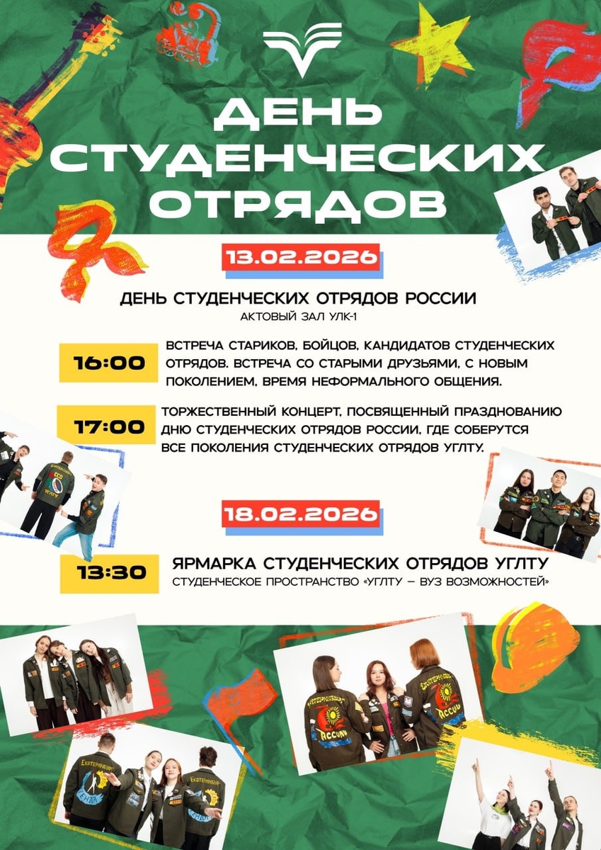 !💚 В преддверии Дня студенческих отрядов России в нашем университете пройдут мероприятия, направленные на популяризацию данного движения. И этот год не исключение! ⚡️13 февраля: • 16:00 — встреча стариков, бойцов, кандидатов студенческих отрядов, праздничная спевка, выставка достижений студенческих отрядов УЛТИ-УГЛТА-УГЛТУ. • 17:00 — Торжественный концерт, посвященный празднованию Дня студенческих отрядов России. 📍Сибирский тракт 37, УЛК-1 (Актовый зал) ⚡️18 февраля: • 13:30 — Ярмарка студенческих объединений, где будут представлены направления деятельности отрядов в УГЛТУ. 📍Студенческое пространство «УГЛТУ — Вуз возможностей!»