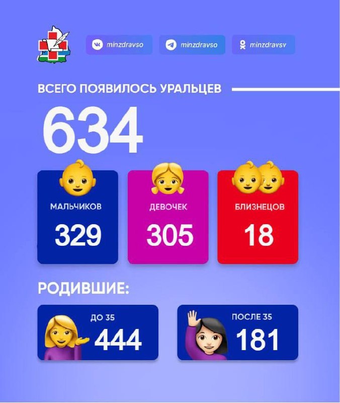 : 329 мальчиков и 305 девочек, из них 9 пар близнецов! 444 мамы родили до 35 лет. 181 мамочка родила после 35 лет. Для одной из мамочек это стали восьмые по счету роды. 188 малышей стали вторыми детьми у своих мам. @zg66