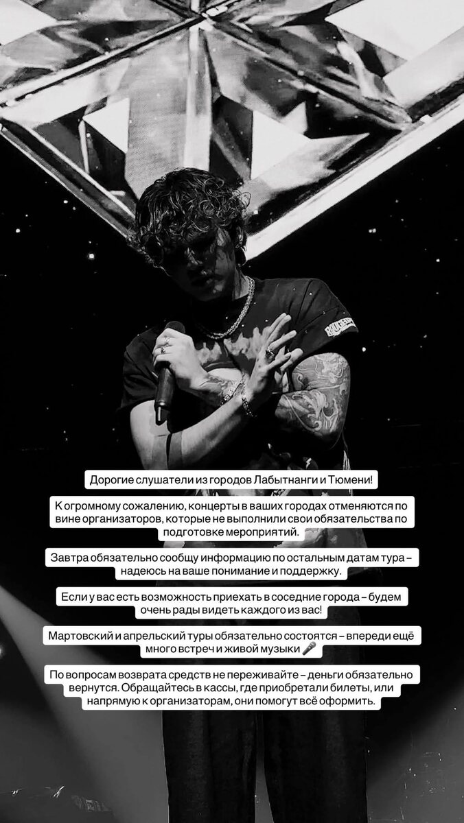 ! К огромному сожалению, концерты в ваших городах отменяются по вине организаторов, которые не выполнили свои обязательства по подготовке мероприятий. Совсем скоро сообщу информацию по остальным датам тура - надеюсь на ваше понимание и поддержку🫶🏻 Если у вас есть возможность приехать в соседние города — будем очень рады видеть каждого из вас! Мартовский и апрельский тур обязательно состоятся — впереди ещё много встреч и больше музыки🎤 По вопросам возврата средств не переживайте — деньги обязательно вернутся. Обращайтесь в кассы, где приобретали билеты или напрямую к организаторам, они помогут все оформить. В этом посте есть большое видео, которое не загрузилось в Дзен. Откройте оригинал поста в телеграме, чтобы его посмотреть