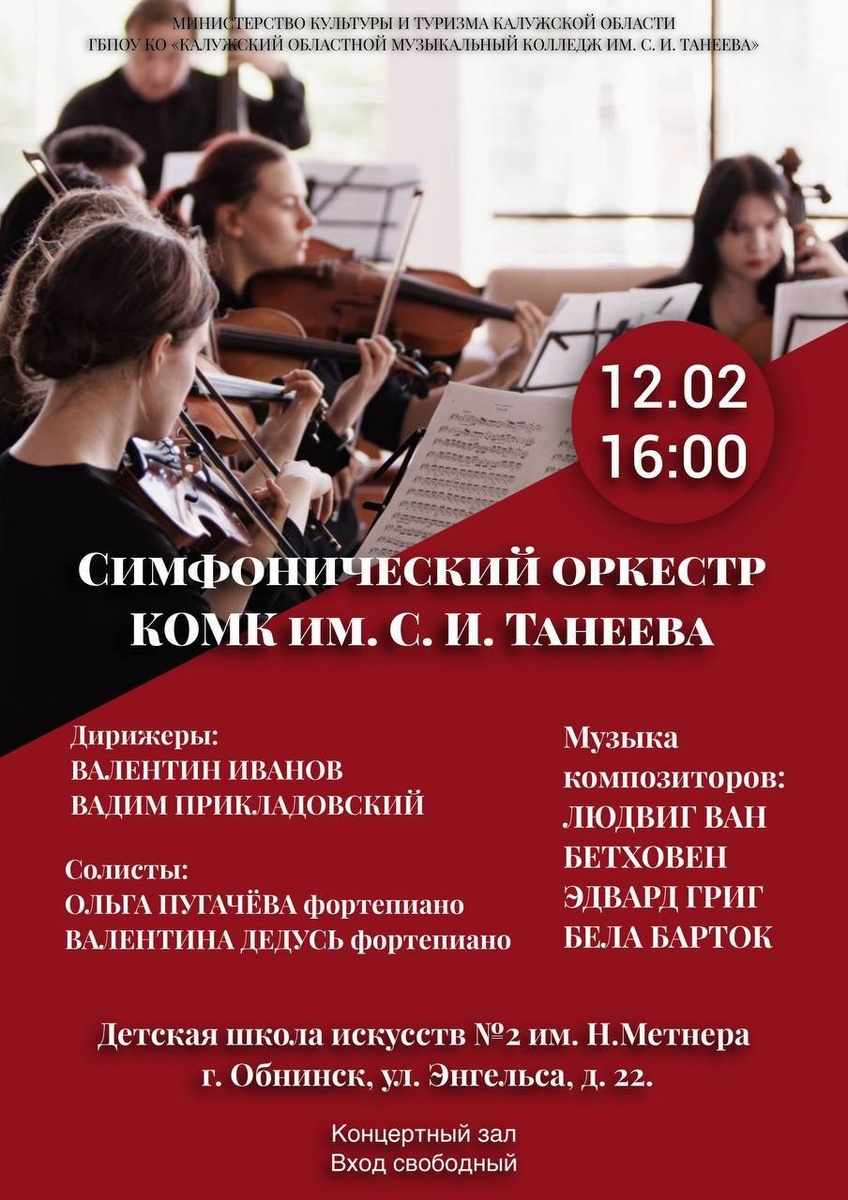 Н. Метнера пройдёт концерт талантливого молодого коллектива - симфонического оркестра Калужского областного музыкального колледжа им. С.И. Танеева. В программе произведения Л. ван Бетховена, Э. Грига, Б. Бартока. Вход свободный. Обнинск, ул. Энгельса, 22. 👍 Подписаться | Ваша реклама