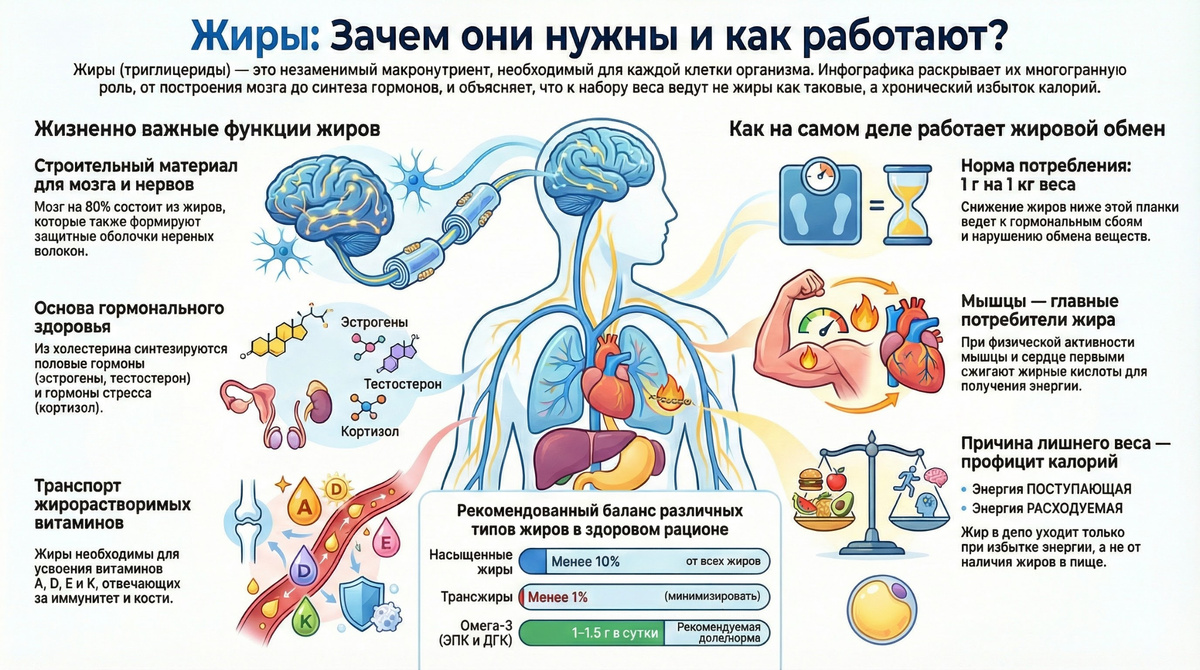 Сегодня мы погрузимся в одну из самых противоречивых тем в диетологии — жиры. Многие из нас привыкли думать о жирах как о главном враге стройной фигуры, но так ли это на самом деле? Сегодня я разберу два глобальных мифа, которые мешают вам построить здоровый рацион и красивое тело. Миф первый: Жиры — это просто калории и лишняя энергия. Многие считают, что жиры нужны организму только как топливо, и если их сократить до минимума, ничего страшного не случится. Это фатальная ошибка. На самом деле, жиры — это сложные макромолекулы (триглицериды), которые выполняют критически важные функции, и сокращать их потребление ниже 1 грамма на килограмм здорового веса я категорически не рекомендую. Во-первых, жиры — это строительный материал. Каждая клетка нашего тела окружена мембраной, состоящей из билипидного слоя. Жирные кислоты, входящие в состав фосфолипидов и холестерина, определяют качество этой мембраны. От того, какие жиры вы едите, зависит проницаемость клетки: как хорошо в нее будут пост