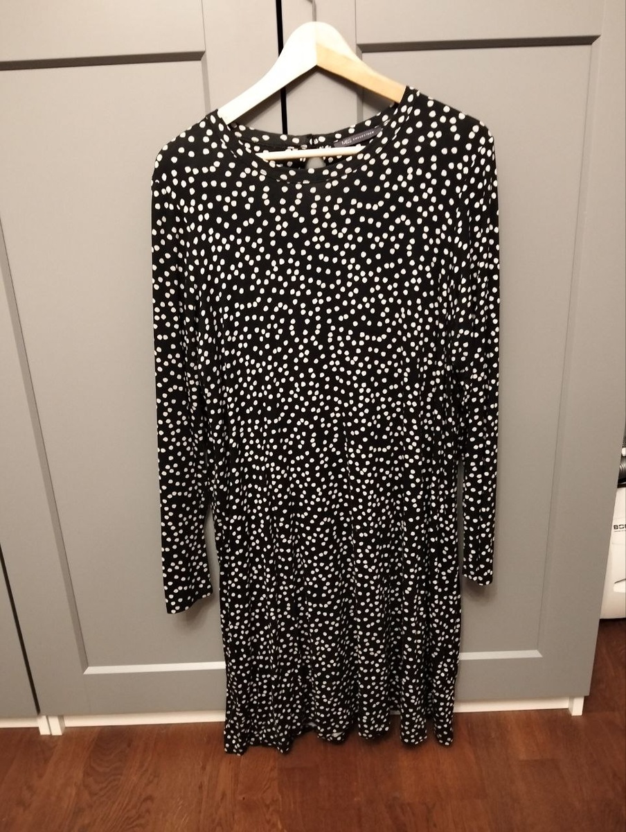 Отдам даром. Платье Marks&Spenser. Чёрное в белый горошек. Состояние нового. Трикотажное, средней длины, свободного кроя, к низу расклешенное. Очень комфортное и мягкое. Р. 52-54. М. Новогиреево