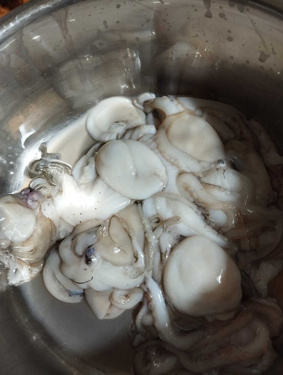1.3. заливаем в емкости достаточно большого объема чищенных ЦЕЛЫХ (не режем их) осьминогов
