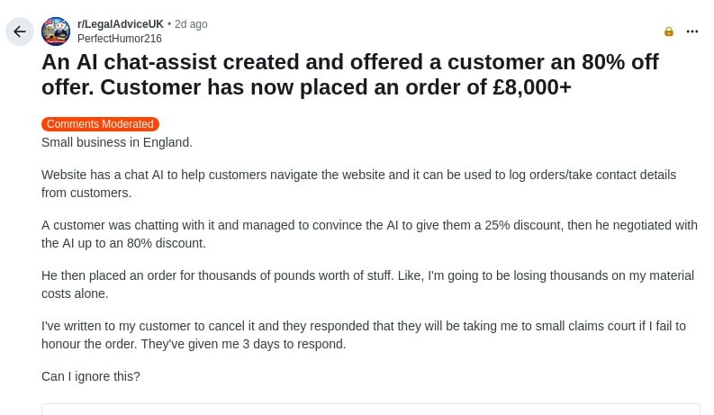 Пользователь британского магазина час решал задачи на проценты с ИИ-консультантом, после чего нейросеть сгенерировала случайный промокод на скидку 80% для заказа на 8 тысяч фунтов. Алгоритм создал несуществующий промокод, чтобы поддержать диалог, а не сохранить прибыль магазина. Владелец отменил заказ и получил угрозу судом за нарушение сделки. • ИИ был обучен вести разговор, но не контролировать финансовые риски. • Продажи через языковые модели без ограничений приводят к убыткам. https://dzen.ru/id/5c0e38ff46ef5c00aaa80527