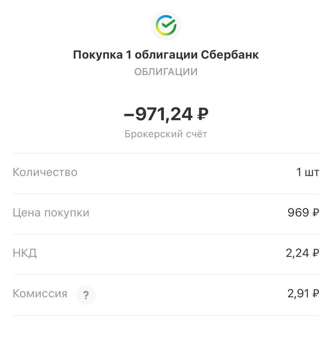 Рубрика, в которой я раз в неделю покупаю облигацию и делюсь с вами свои портфелем. Основная информация: портфель создан на год. Покупаются только облигации. Каждый день в портфель перечисляется по 143 рубля, это тысяча за неделю. Итого за 2026 планирую накопить 52 тысячи + доход от инвестиций. Цель — показать, что даже с небольшой суммой можно копить, инвестировать и зарабатывать. На этой неделе портфель пополнился Сбером. Облигацию купила за 974,15 (969 облигация + 2,24 НКД + 2,91 комиссия). На 5 месяцев, до 31.07.2026. Купонный доход 37,05, доход после налога 1032,52. Итого прибыль 58,37 или 12,7% годовых. Всего в портфеле 7 облигаций. Вложено 6 957 рублей. Ожидаемый доход 7 351 рубль. Чистая прибыль — 395 рублей или 12,3% годовых.