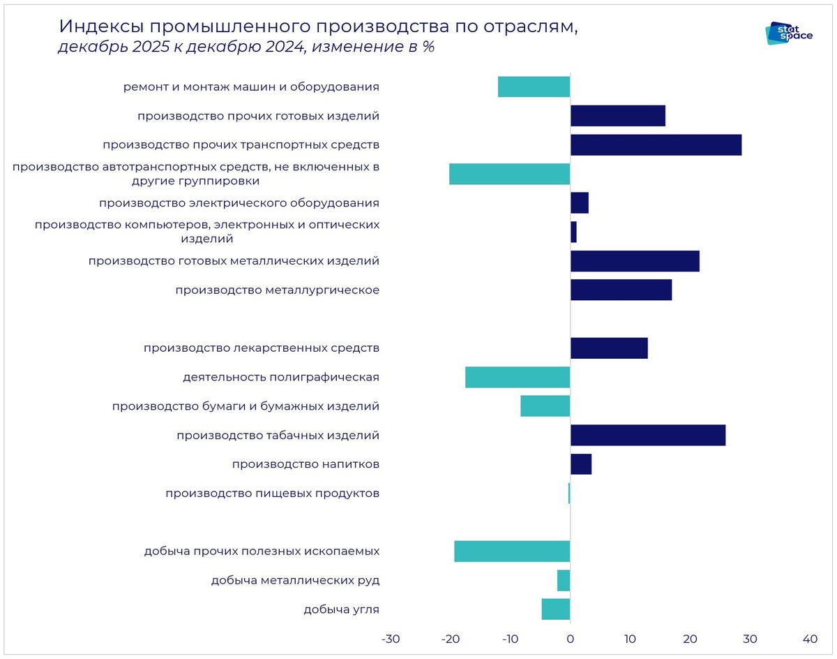 Если смотреть на промпроизводство в декабре в разрезе отраслей, то мы увидим картину, в значительной степени повторяющую уже привычную за последнее время историю "оборонка растёт, добыча падает, остальное стагнирует". Но есть и отличия: в лидерах роста (на втором месте после вполне себе около-оборонных прочих транспортных средств, +28.6%) оказалась... табачная промышленность: +25.9% к прошлому декабрю! Хорошо себя чувствуют лекарственные изделия (+12.9%), из гражданских отраслей в небольшом, но плюсе (+3.5%) оказались напитки. Ещё любопытный момент: компьютеры-электроника-оптика, до этого бывшие в списке лидеров (второе место в сентябре, к примеру) показали очень скромный рост на 1%. В добыче всё плохо, особенно в "прочей" (кроме угля и руд - то есть, в нефтегазе): -19.4%.