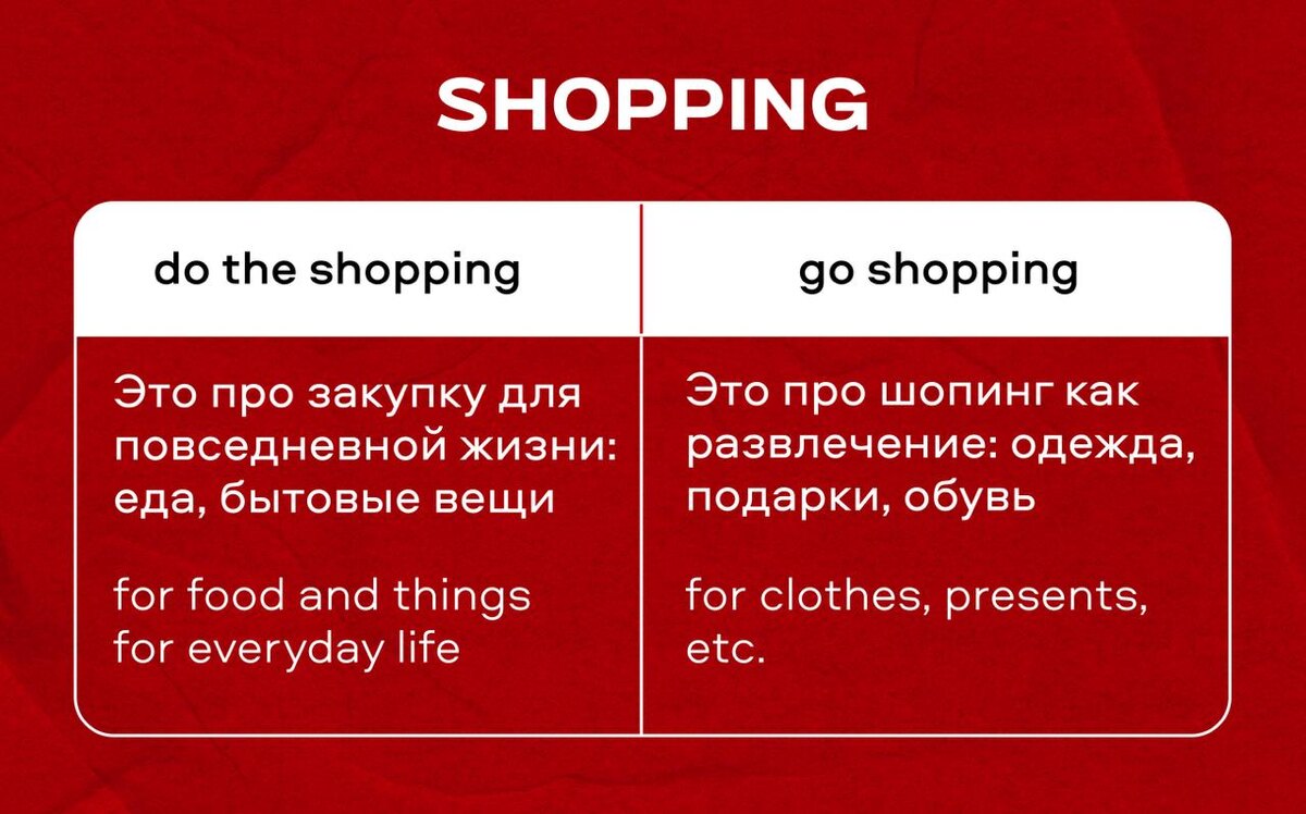 При этом, некоторые могли вспомнить словосочетание - «go shopping». «Go shopping» - это ходить по магазинам.
